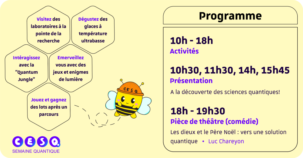 La semaine se clôt par une journée grand public le samedi 28 mars, à laquelle plus de 350 visiteurs ont répondu présent l’an dernier. Munis d’un passeport quantique qui présente les activités proposées, curieux et avertis pourront visiter les laboratoires en présence des chercheurs. Une opportunité rare de découvrir l’envers du décor à travers des expériences à la pointe de la recherche en sciences quantiques.